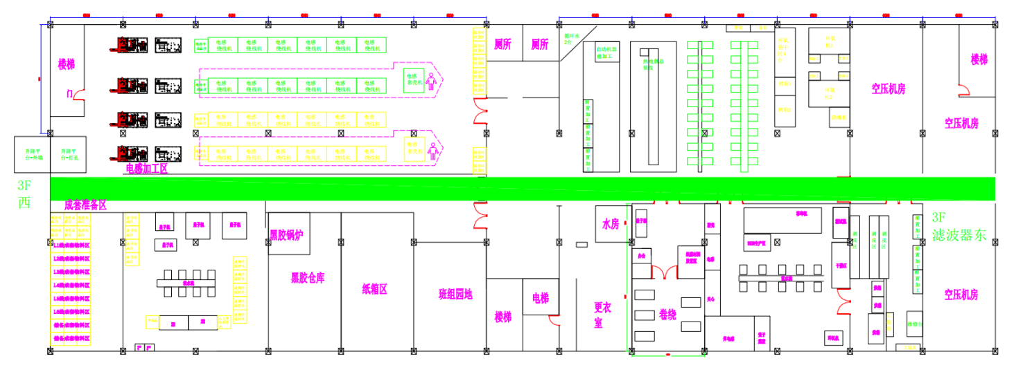 l 從宏觀層面,考慮整個濾波器生產車間的功能區域,減少物流搬運次數;構建連續流的生產線,導入物流配送系統應用ECRS原則、簡易自動化等方法,重新提排布生產線。