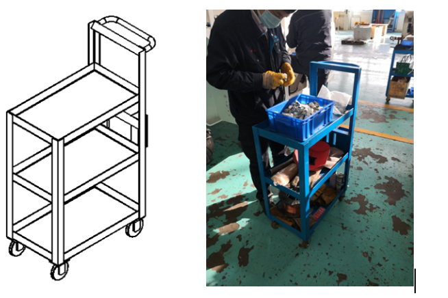 通過征求一線員工意見,確定工具小車的形式和功能,經使用后效果很好,能夠減輕工人工作強度,并能節約物料搬運時間。