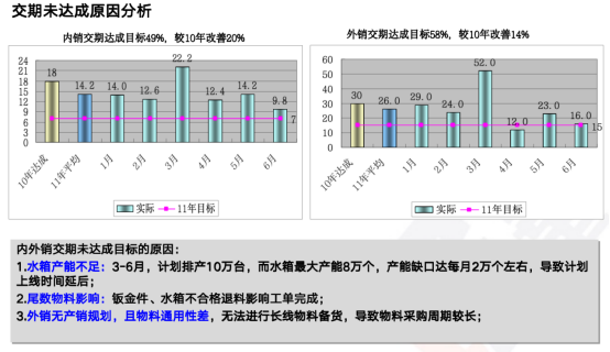 通過對配件車間內(nèi)油壓機(jī),火排沖壓設(shè)備,火排裝配線,水箱沖壓設(shè)備,小U開料設(shè)備,總裝車間備料區(qū)等設(shè)施進(jìn)行重新規(guī)劃、調(diào)整,減少車間一次物流距離1500M,在制品面積下降63%,庫存金額下降50%。通過燃熱產(chǎn)品部物與情報現(xiàn)狀圖與理想圖對比,得出目前存在的問題并設(shè)置改善對策。