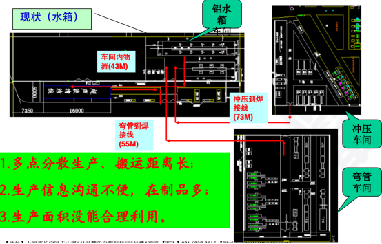 分析鋁水箱車間物流示意圖發(fā)現(xiàn),鋁水箱沖壓至裝配工序物流距離73M,彎管工序至裝配車間55米。且存在多點分散生產(chǎn)、搬運(yùn)距離長;生產(chǎn)信息溝通不便,在制品多;生產(chǎn)面積沒能合理利用等問題,因此重新調(diào)整生產(chǎn)布局,簡化物流路線。