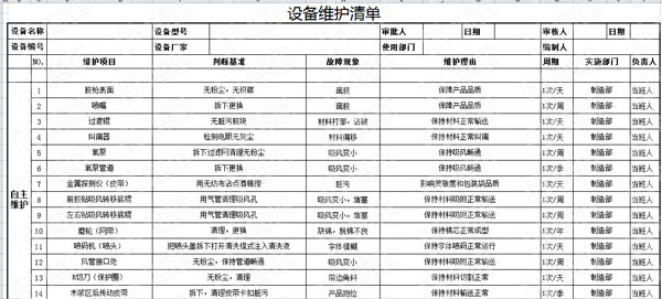 在自主與專業維護清單完成后,根據設備故障的判斷基準、故障現象、維護的周期、維護的部門和責任人,制定自主與專業維護清單。