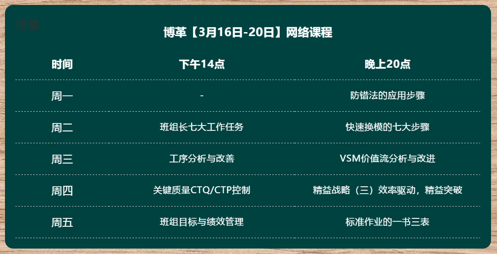 為助力企業(yè)在抗疫期間的穩(wěn)健發(fā)展,博革咨詢特推出騰訊課堂線上直播《金牌班組長培訓(xùn)》《企業(yè)精益戰(zhàn)略實(shí)施》《精益工具應(yīng)用》等內(nèi)訓(xùn)精品課程,與您共渡難關(guān)!