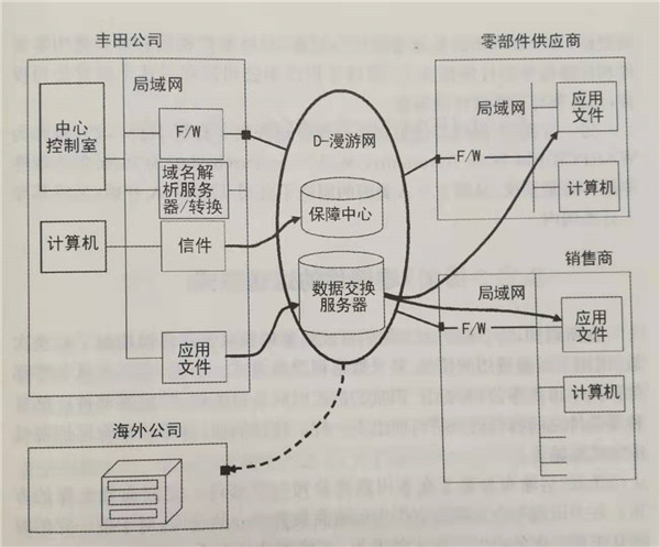 在豐田汽車公司,TDC開發了被稱為“D一漫游網”的豐田集團內部網絡,并通過它建立了豐田BtoB( Business to Business)系統的新TNS,所謂豐田集團內部網絡,雖然字面上稱為“內部網格”,但實際上就是一般所說的企業間的“外部網絡”。新TNS的基本結構如圖1所示,與原來相比,傳輸速度加快了,一個文件夾的容量也變大了,文件信息和圖像信息也可以傳輸了。